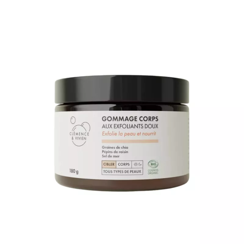Offrez à votre peau un véritable soin de douceur avec le Gommage pour le Corps Clémence & Vivien. Sa synergie d’exfoliants naturels : sucre, sel marin, graines de chia et poudre de pépins de raisin polit la peau en douceur et stimule le renouvellement cellulaire.