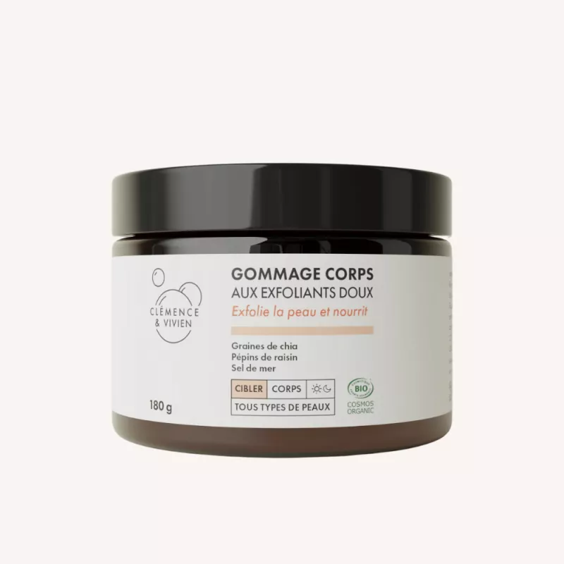 Un exfoliant corps naturel qui allie efficacité et douceur grâce à un mélange de grains 100% d’origine naturelle : sucre, sel marin, graines de chia et pépins de raisin. Ce gommage naturel lisse, nourrit et laisse la peau satinée, sans film gras. Formule clean beauty, vegan, made in France.