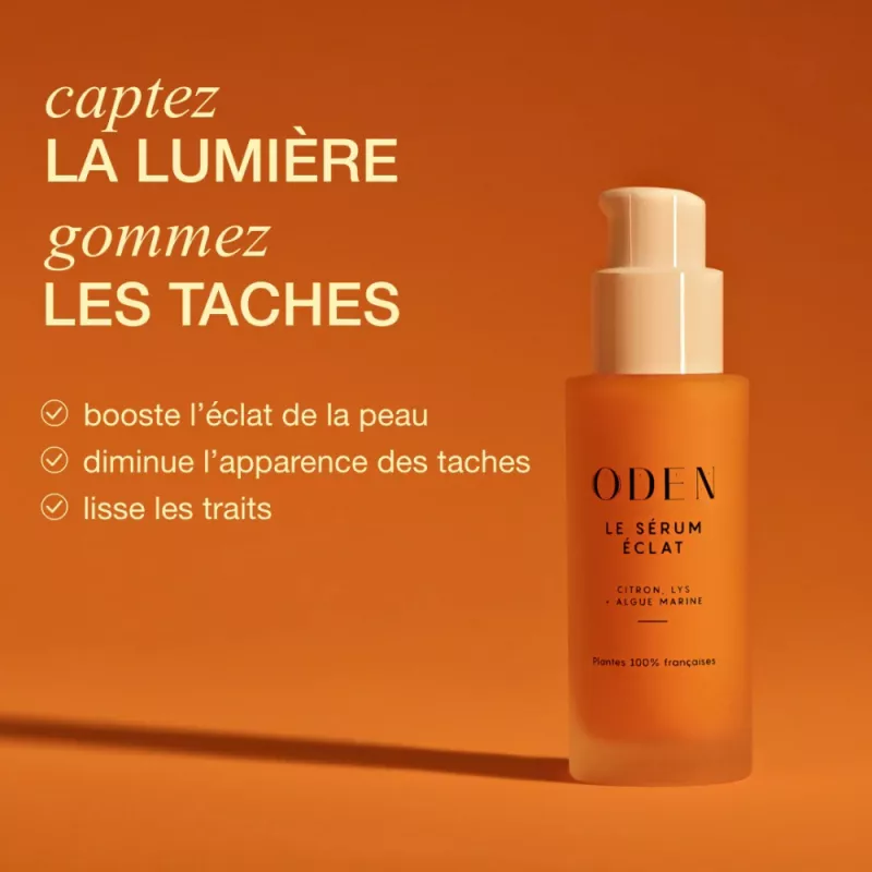 Le Sérum Éclat est un soin botanique anti-taches conçu pour raviver l'éclat du teint et estomper les taches pigmentaires. Formulé à partir de citron, de lys blanc et de bio-rétinol issu de la criste marine, il agit en douceur tout en respectant les peaux sensibles.