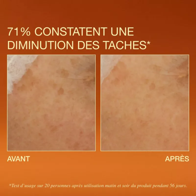 Parce qu’il illumine, unifie et rend la peau plus belle jour après jour. Ses extraits botaniques français et son complexe breveté offrent un cocktail d’actifs puissants tout en douceur. Le teint gagne en clarté, les taches s’atténuent, et la peau retrouve fraîcheur et vitalité naturelle. Un geste simple, des résultats visibles : -20% de taches dès 28 jours*.