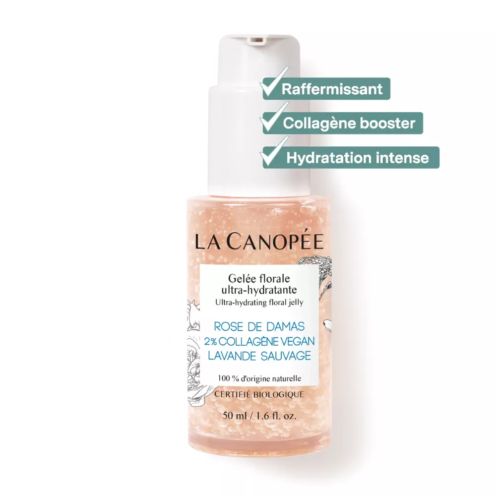 La Gelée florale ultra-hydratante est un soin visage haute performance à la texture fraîche et fondante. Enrichie en hydrolats de rose de Damas et de lavande fine sauvage, elle tonifie et apaise immédiatement la peau. Sa formule associe 2 % d’acides aminés de collagène végétal à de l’acide hyaluronique de bas poids moléculaire pour stimuler la production de collagène et lisser les ridules de déshydratation.