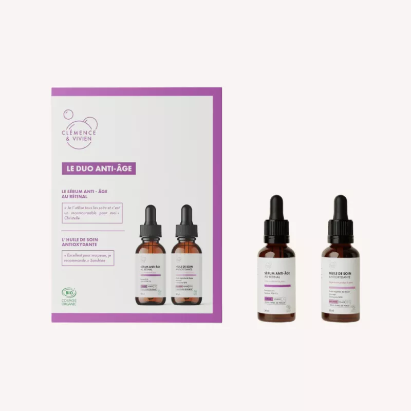 Le Coffret Duo Anti-Âge réunit deux soins best-sellers Clémence & Vivien pour lisser les rides, raffermir la peau et lui redonner éclat. Le Sérum anti-âge au rétinal stimule le renouvellement cellulaire, tandis que l’Huile de soin antioxydante nourrit, protège et illumine. Un cadeau beauté clé en main, naturel, vegan, made in France et parfaitement coordonné pour une routine du soir efficace.