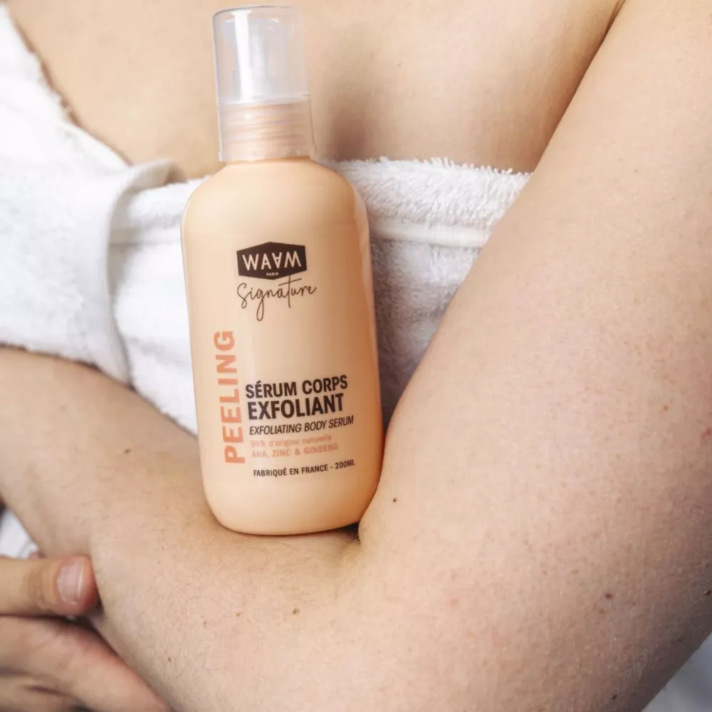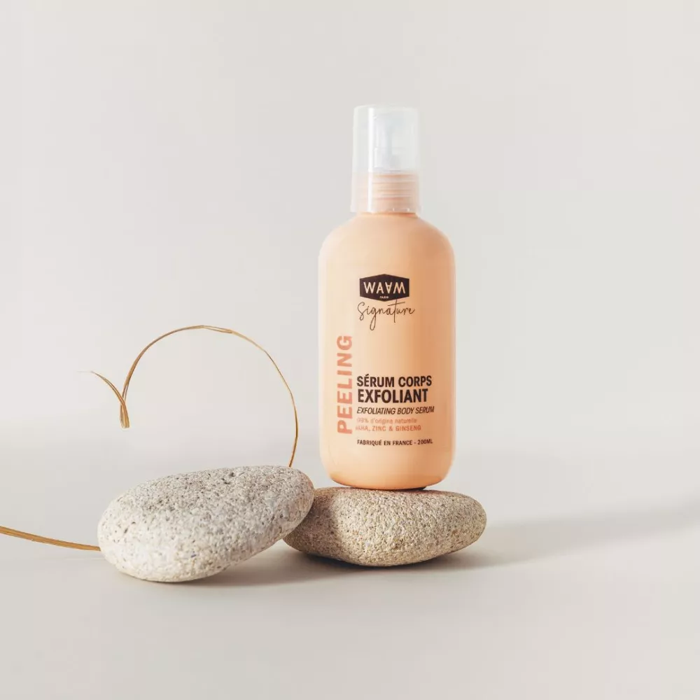 Un sérum exfoliant doux pour le corps, sans rinçage, formulé à 99% d’ingrédients naturels. Il élimine les cellules mortes, lisse le grain de peau et agit sur les irrégularités grâce aux AHA, au Zinc PCA et à l’extrait de ginseng. Sa texture fluide et non collante laisse la peau douce, uniforme et purifiée.