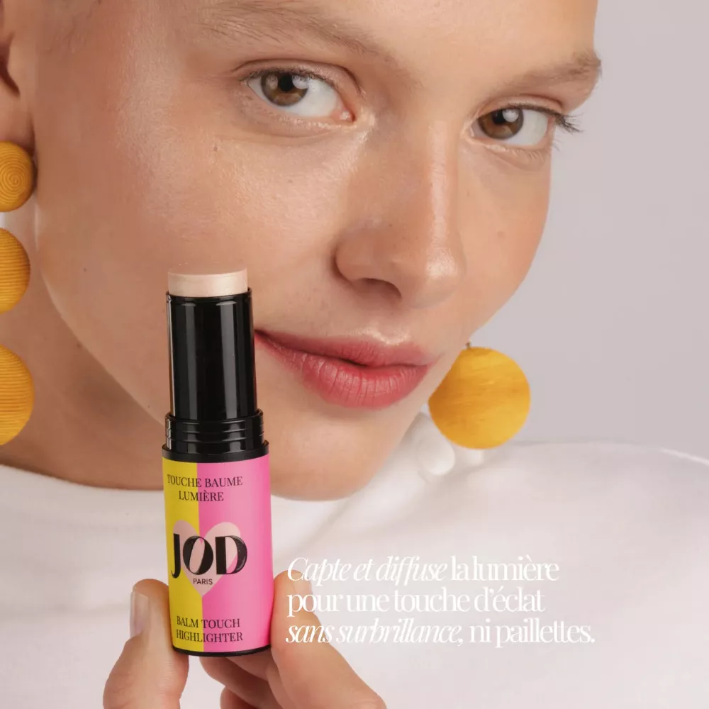 Touche Baume Lumière : enrichi en nacres naturelles, il accroche la lumière, floute le grain de peau et met en valeur les volumes du visage.