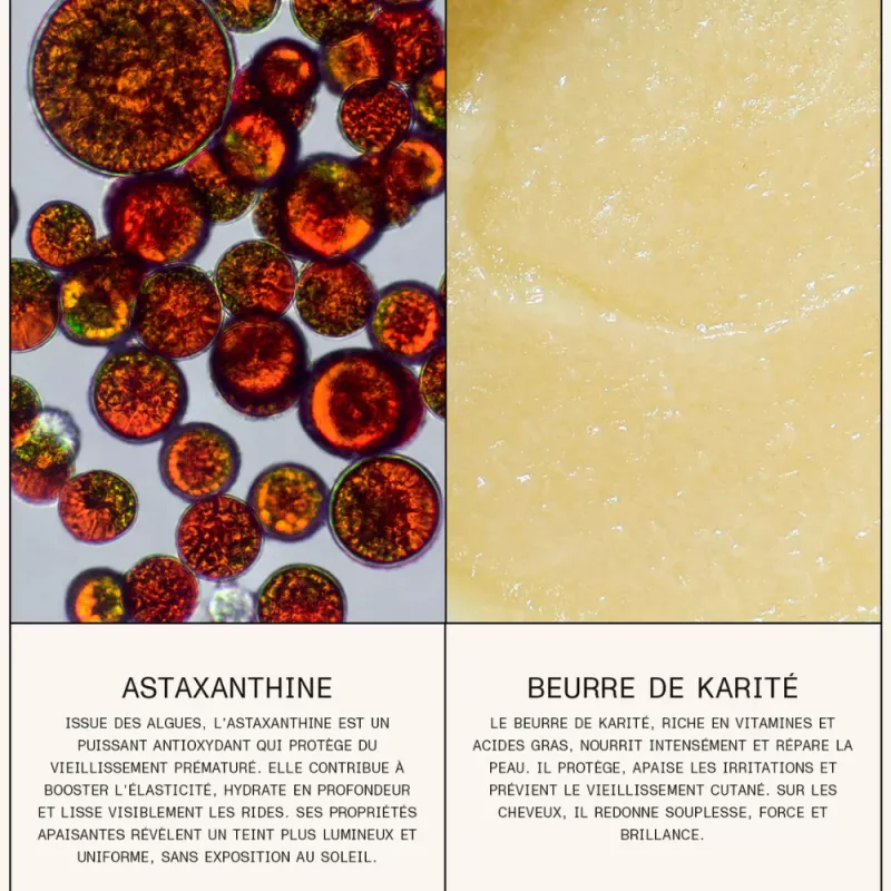 L’astaxanthine, issue des algues, est un antioxydant naturel puissant reconnu pour protéger la peau du stress oxydatif, des UV et de la pollution. Elle contribue à améliorer l’élasticité, hydrater la peau, lisser les rides et renforcer la barrière cutanée. Ses propriétés apaisantes aident également à calmer rougeurs et irritations, tout en stimulant la microcirculation pour un teint plus uniforme et éclatant.