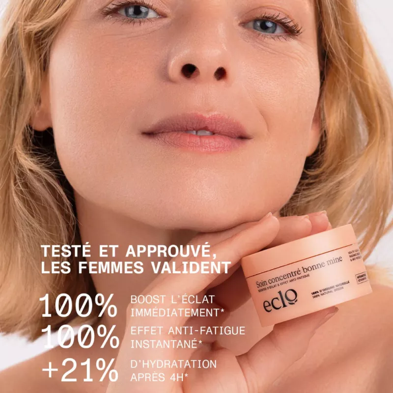 Effet bonne mine immédiat. Booster d’éclat instantané. Effet anti-fatigue visible. Peau visiblement lissée et repulpée. Texture fondante au fini velours, non grasse et sans démarcation.
