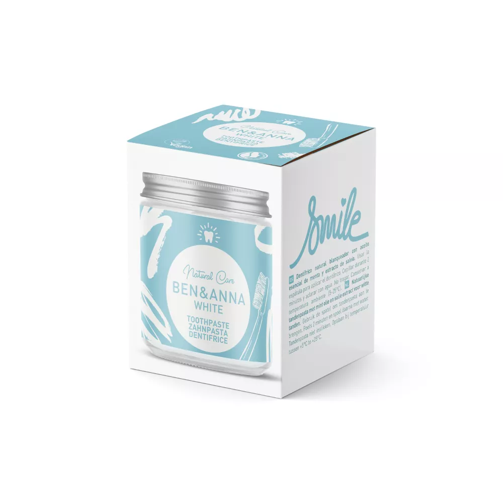 Affichez un sourire resplendissant grâce au dentifrice en pâte naturel WHITE de Ben & Anna. Formulé avec de la sauge, riche en vitamine A et en antioxydant, il nettoie et blanchit efficacement les dents sans les agresser.