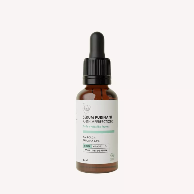 Le Sérum purifiant anti-imperfections a été développé pour rééquilibrer les peaux mixtes à grasses et réduire les imperfections. Lorsque les glandes sébacées produisent trop de sébum, les pores se bouchent, la peau brille et des boutons peuvent apparaitre. Sa formule naturelle associe zinc PCA, acides exfoliants (AHA/BHA) et actifs apaisants pour purifier, exfolier et uniformiser la peau sans l’agresser. Jour après jour, le teint est plus net, plus lisse et plus équilibré.