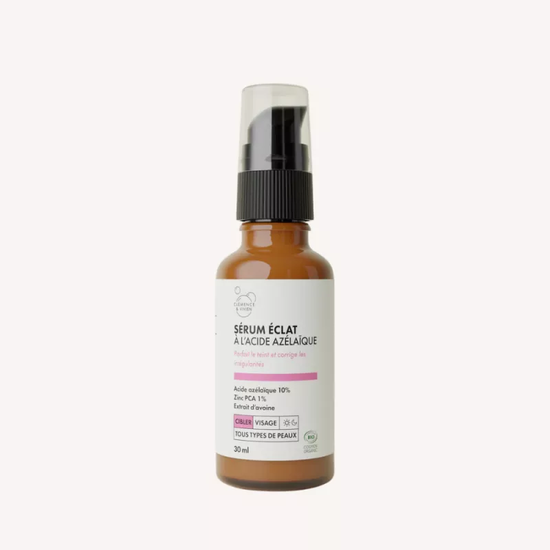 Ce sérum éclat naturel à l’acide azélaïque 10% illumine le teint, régule le sébum et limite les imperfections occasionnelles. Enrichi en zinc PCA, acide hyaluronique et extrait d’avoine, il purifie tout en apaisant la peau. Vegan, compatible grossesse et 99,99% d’origine naturelle, c’est le sérum idéal pour retrouver une peau douce, uniforme et naturellement lumineuse.